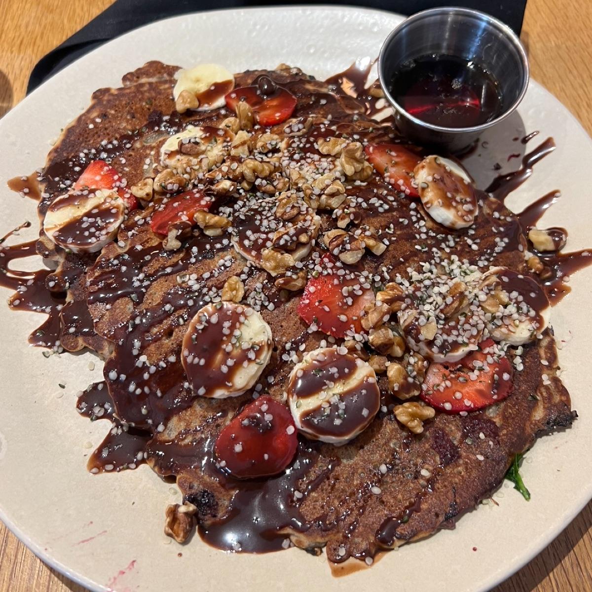 gluten-free pancakes with banana, strawberry, walnuts, hemp seeds, chocolate sauce, and maple syrup! very decadent yet so fresh! delicious