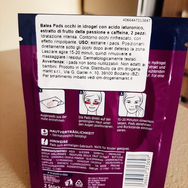 Pads occhi in idrogel con acido ialuronico, estrato di frutto della passione e caffeina. Anche questi uso spesso, sono rinfrescanti , danno sollievo agli occhi stanchi dopo una giornata di lavoro.
