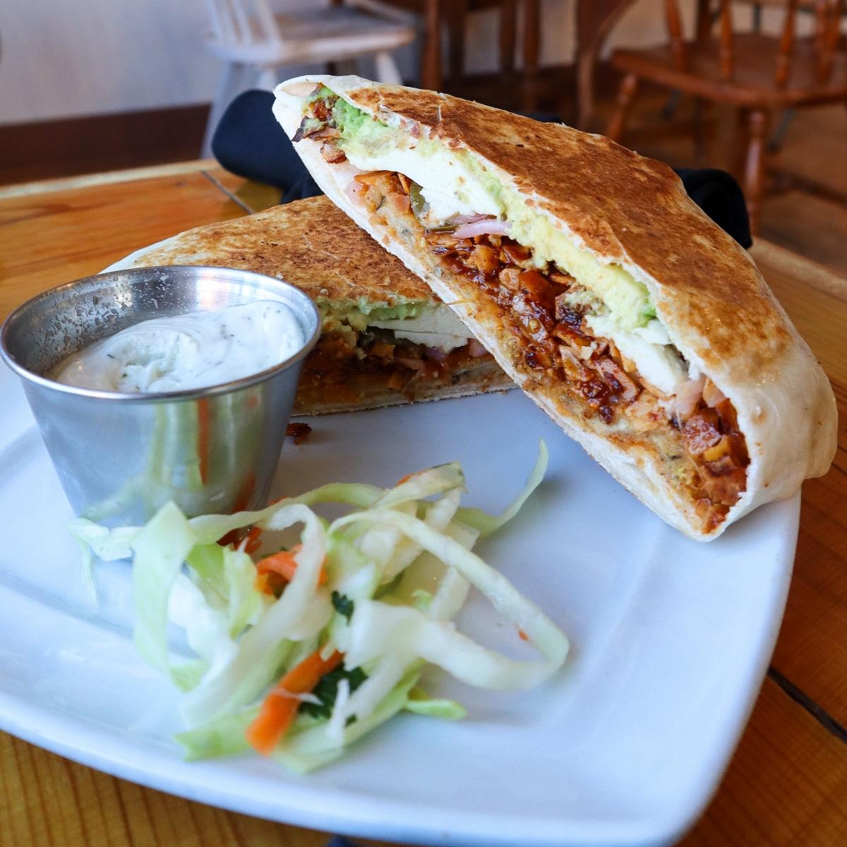 This was stuffed with crispy breaded eggplant, coated with smoky dojo hot sauce, smokey coconut bacon, fresh avocado, shredded #cashew cheeze, pickled onions and jalapenos. It's also served with a of #housemade farmhouse #ranch dressing. This had so many different flavors, both smokey, tangy, #spicy with a hint of sweetness. This was quite literally heaven. I also love their #cashew cheese. The slices and shreds are so thick and creamy. The #coconut bacon also added a bit of a crunch. This was overall just fantastic. It was only $13 as well, and with all the ingredients, it's a fantastic value. Please order this! You will absolutely not be disappointed!