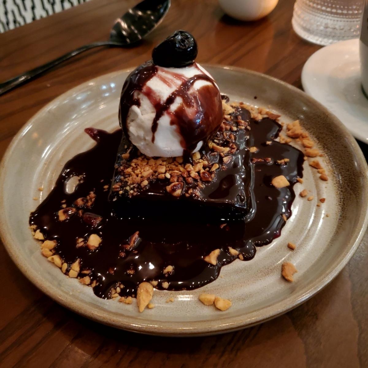 This was served warm, and they poured the hot fudge over it when it was brought to the table. I would've preferred they left the cup behind though 😅🤤 The brownie was dense and fudgy but still had some cake crumb vibes. I prefer all fudgy, but this was still lovely. It had vanilla ice cream, a fancy cherry that flavoured the ice cream a bit, and peanuts. If I get this again I'll ask for #nonuts because I don't like crunchy with my soft things.