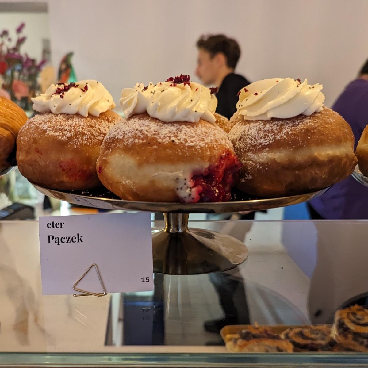 Polish donut filled with jam and topped with whipped cream. Not very sweet.My Polish boyfriend said it was very authentic#veganisnotscary
