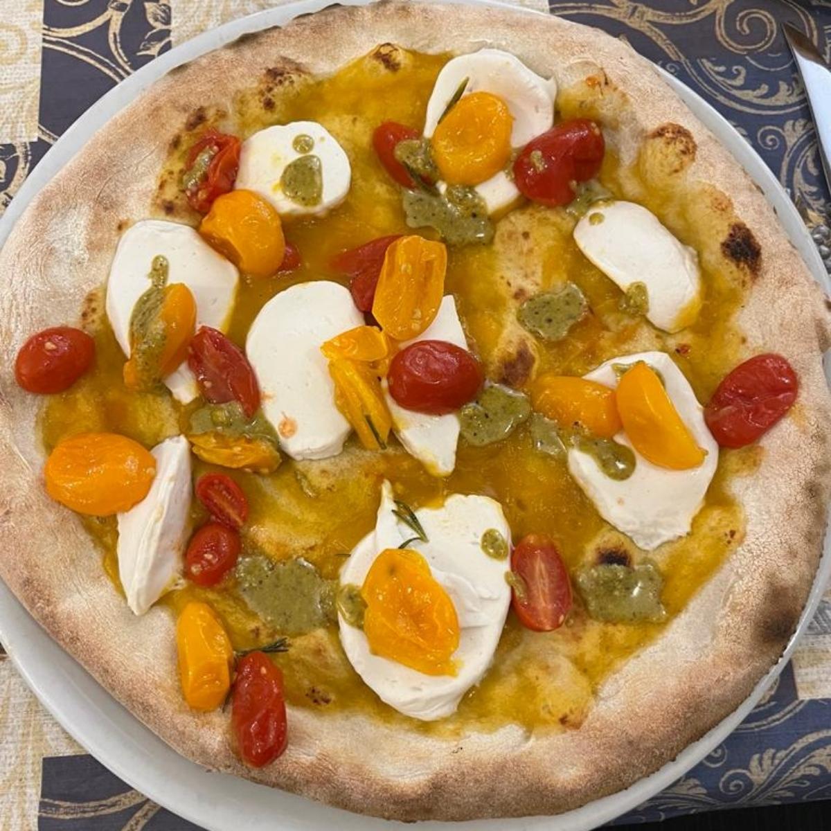 Pizza buonissima con mozzarella Dream farm, crema di datterini gialli, pesto e pomodorini rossi e gialli semisecchi
