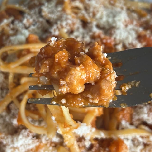 He probado la Soja texturizada tamaño mediano para preparar la boloñesa y creo que me gusta más la pequeña. Pero es solo cuestión de gustos según la textura que quieras.