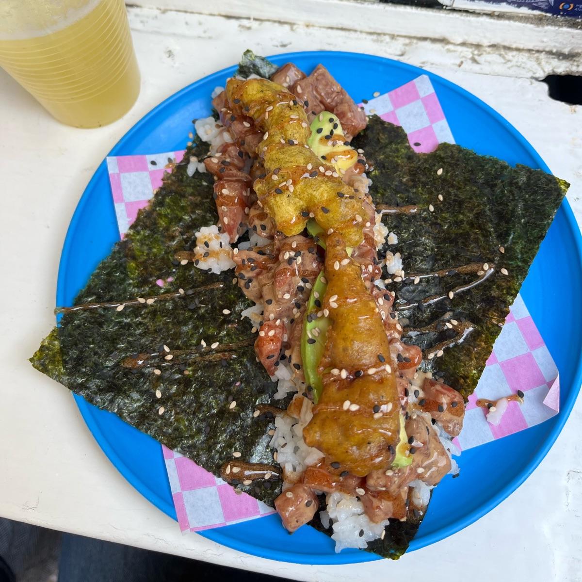 Taco vegano con nori y no atún (hecho de tomate marinado)