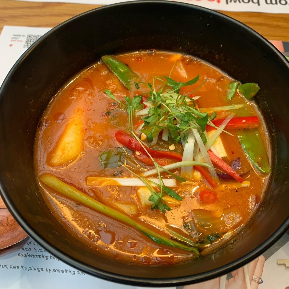 I LOVED this. What a lovely Korean-style broth. Filled with tofu, tteokbokki (my first time trying this but definitely want to try more!), bok choi, kimchee and red onion. It is fairly spicy.