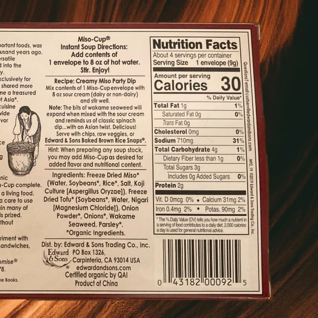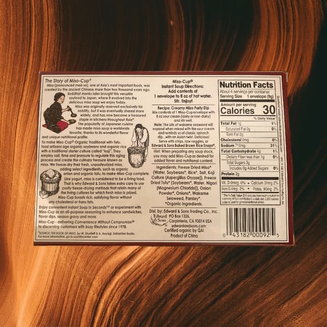 Edward & Sons also packages their miso in envelopes, which is a step closer to preserving trees and petroleum reserves than by providing disposable cups like other companies do.