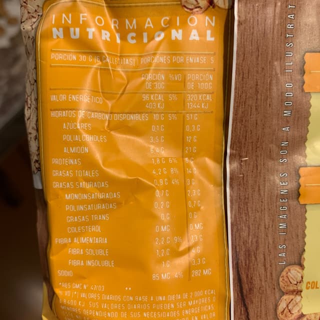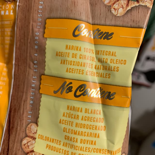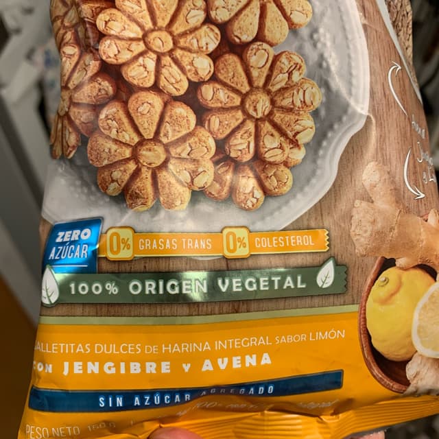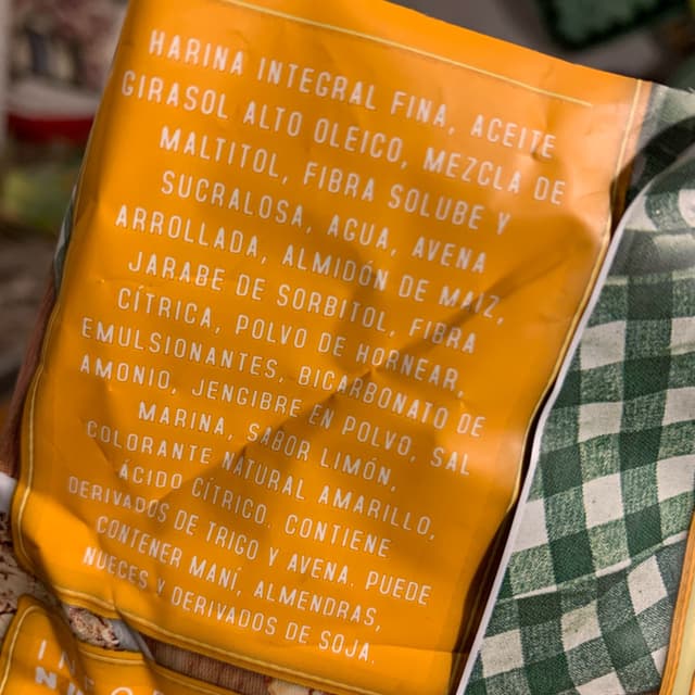 HARINA INTEGRAL FINA, ACEITE GIRASOL ALTO OLEICO, MEZCLA DE MALTITOL, FIBRA SOLUBE Y SUCRALOSA, AGUA, AVENA ARROLLADA, ALMIDÓN DE MAIZ, JARABE DE SORBITOL, FIBRA CÍTRICA, POLVO DE HORNEAR, EMULSIONANTES, BICARBONATO DE AMONIO, JENGIBRE EN POLVO, SAL MARINA, SABOR LIMÓN.