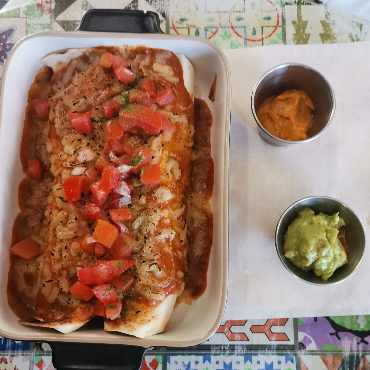 My partner had this one. It was way too spicy for me but still very delicious. I've had the plant based mince enchiladas before so I know that it is very filling and yummy.