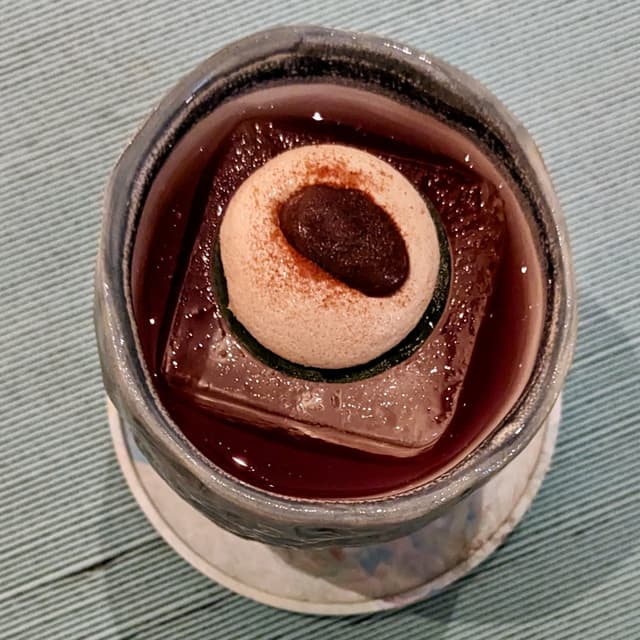 The bartender explained that the idea behind this cocktail was to feature foods that astronauts purportedly eat in outer space. 👩‍🚀🚀 Apart from gin, Campari, and Cocchi, this cocktail mainly consisted of clarified peanut butter and kyoho grapes (as a reference to peanuts and freeze-dried fruits), giving a concentrated scent of PB&J without the oil. 🥜🍇 The garnish on top was inspired by freeze-dried Neapolitan ice cream sandwiches (though some have debunked the myth that astronauts really consume them) - soy protein eggless meringue flavoured with tonka bean, strawberry powder, and coconut nectar, topped with a dollop of housemade carob gel (in lieu of cacao). 🍨🍫 I also found it interesting that they went all-out with the concept of the drink, serving it in a Lunite ceramic cup locally handmade by Art Occasians, with a textured surface reminiscent of the pitted craters on the moon~ 🌕🌑 Quite pricey but props for the creativity! 🍸 P.S. The coaster was also locally made by The Plastic Project / Plastify using recycled plastic~ ($26) #sgvegan #sgdrinks #cocktail #minorityowned
