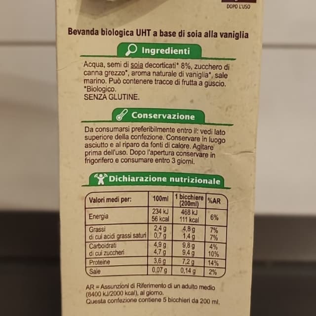 Mia sorella in partenza per le vacanze mi ha portato le cose aperte che aveva in frigo, compreso questo latte che non avevo mai assaggiato. Fortunatamente l'ho usato per il cappuccino a colazione e non per fare qualcosa di salato perché non mi ero proprio accorta guardando il davanti della confezione che fosse zuccherato e aromatizzato alla vaniglia. Sono abituata al latte di soia più neutro possibile ma l'ho trovato piacevole e non stucchevole. È biologico e senza ingredienti strani.