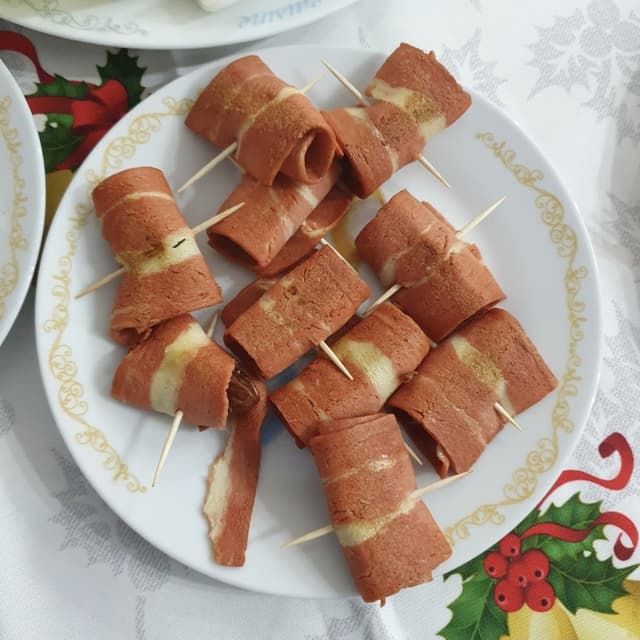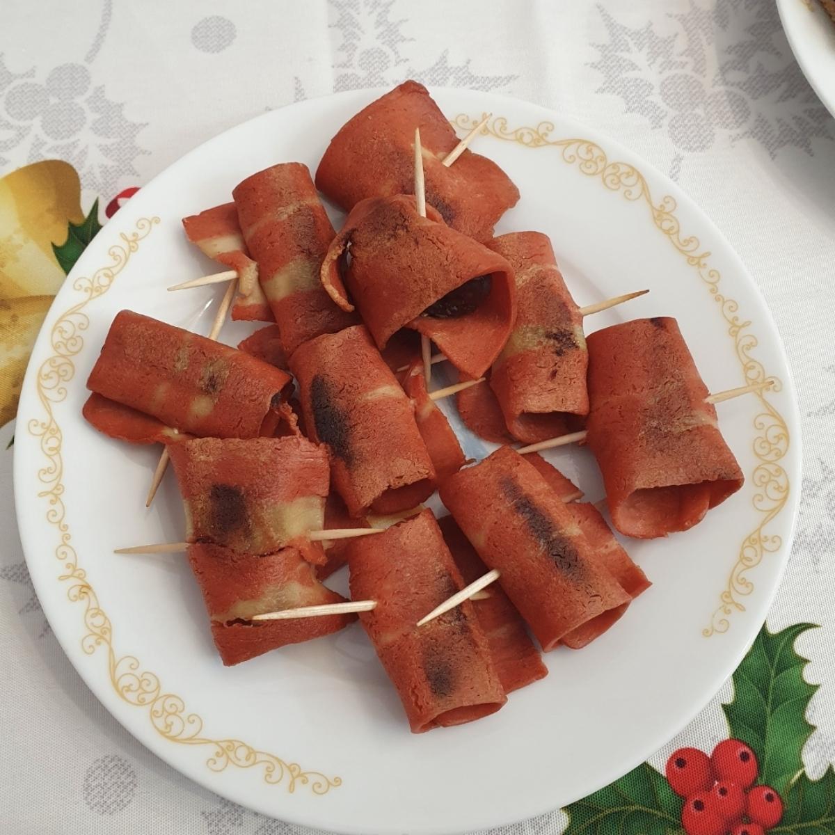 En mi casa siempre servimos dátiles con beicon (también llamados delicias de Elche) por Navidad, son mi aperitivo favorito. Los hicimos gracias a este beicon vegano.
