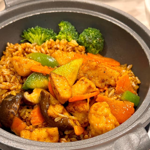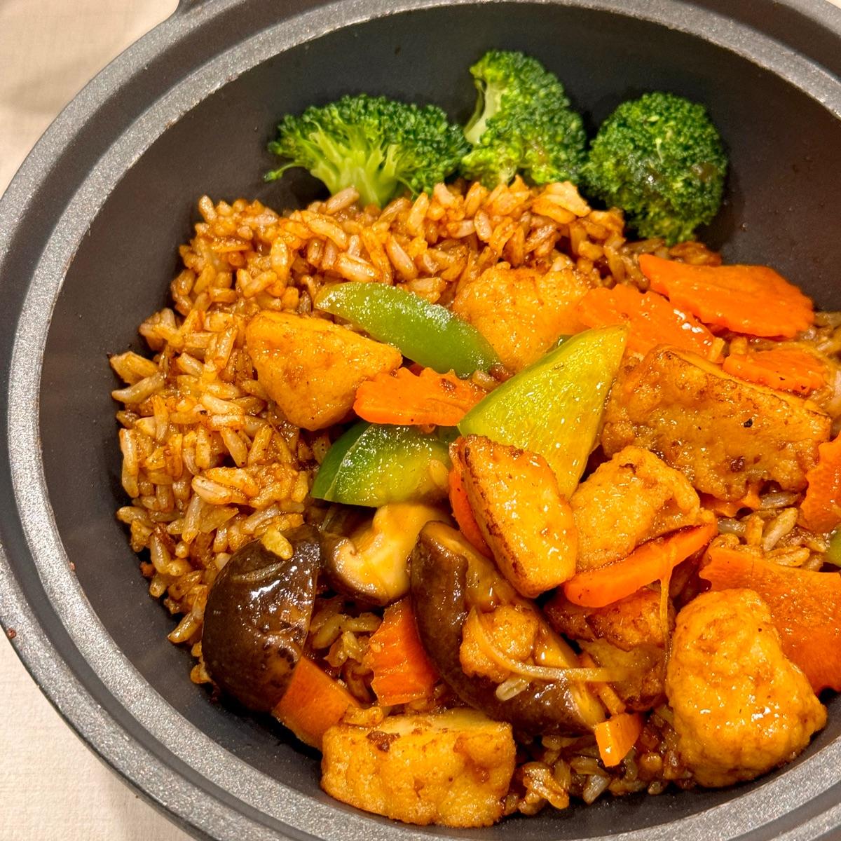 Truly a satisfying meal. I chose to add brown rice instead of white. Delicious and fragrent sizzling rice dish served in a super hot claypot, with veggies and mock chicken chunks. The chicken chunks we cooked well and had a super soft texture. Had a bit of charred rice at the bottom with some amazing flavour. Highly recommended.