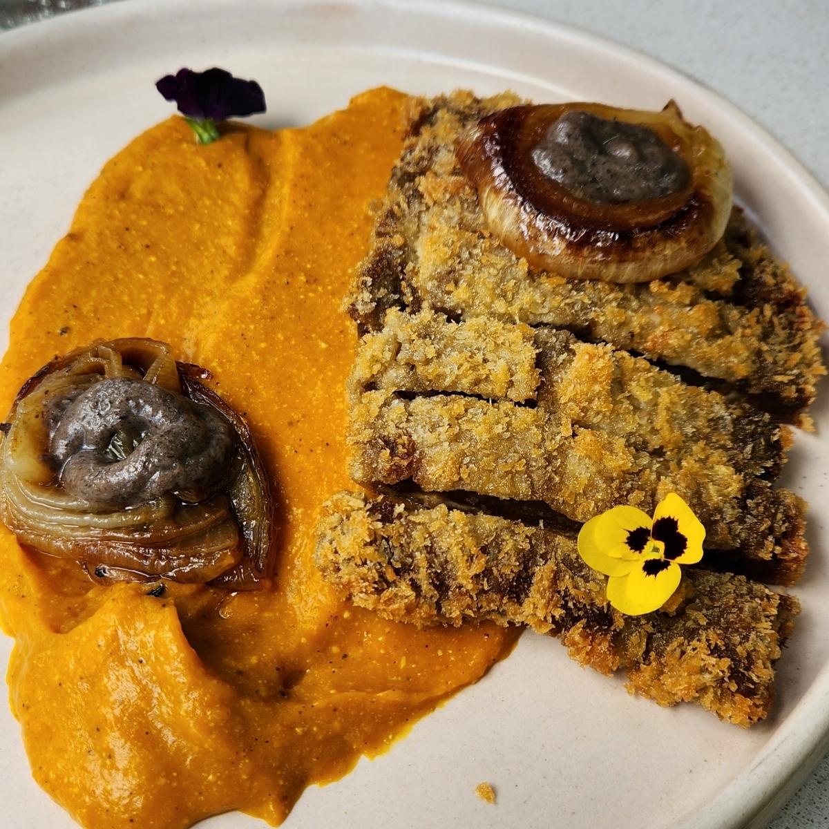 Riquisimo plato!! Las berenjenas hechas en milanesas traen un puré de cabutia y cebollas caramelizadas