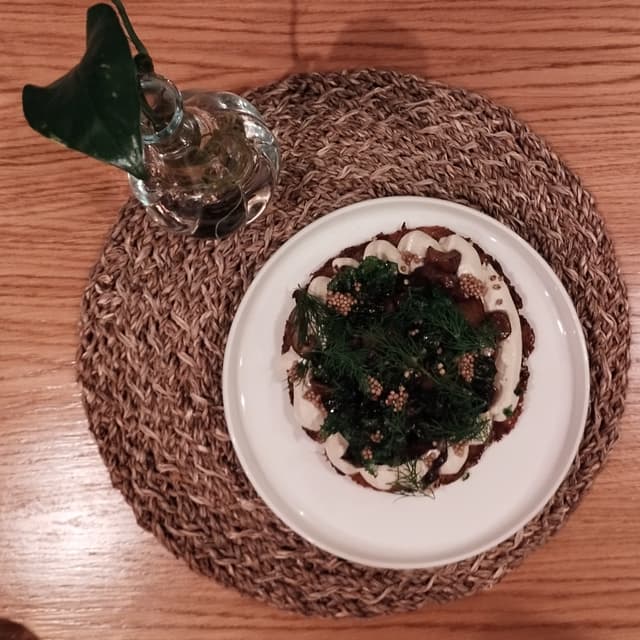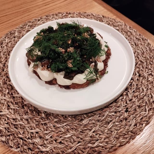 Ingredients: sauerkraut pancake, garlic "cream cheese", mushrooms, dill, kale.
