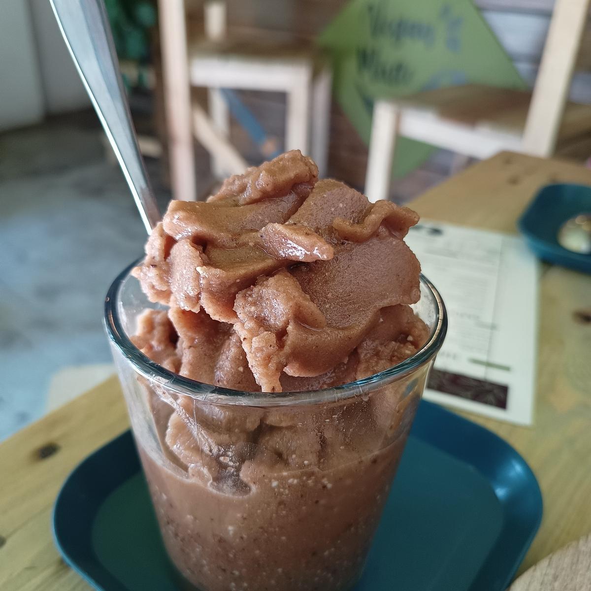 Contiene platano, cacao y coco. Está buenísimo y en cantidad suficiente. Es frappé y fresco. Es dulce 🤤.