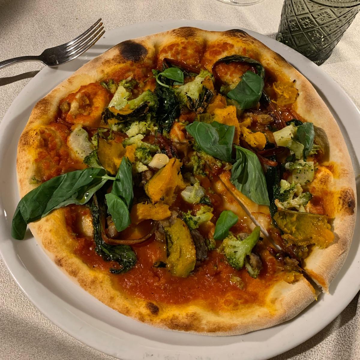 Pizza Ortolana (da richiedere senza mozzarella) mangiata al Fagus. Quello che mi piace di questo ristorante è che hanno pochissime pizze in menù ma rispettano tutte la stagionalità . La mia pizza aveva zucca, castagne, erbette, broccoli. Molto buona!