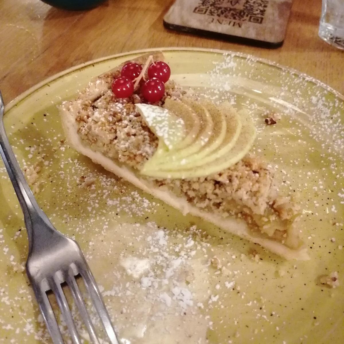 Dolce vegan alle mele - buonissimo! Dalla descrizione mi aspettavo un dolce ripieno, invece ha una pasta molto simile alla crostata con un crumble di mele ottimo, non troppo dolce.