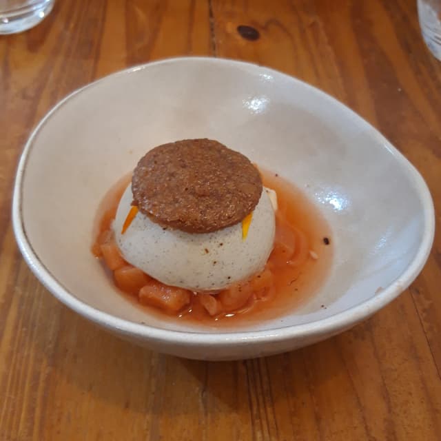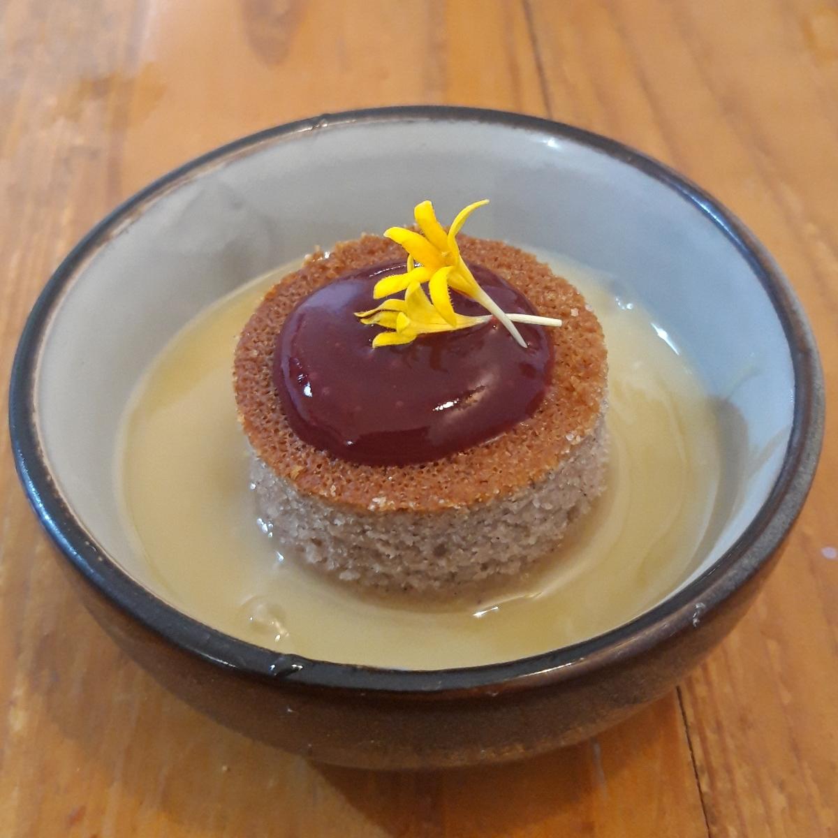 Amazing combination of sweet potato cake with a sweet white chocolate sauce and a saffron gel on top. Absolutely worth it trying the degustation menu.
