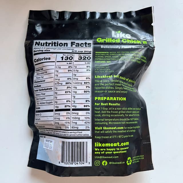 I tried this a while ago and forgot to write up my review, but according to my notes, it was essentially identical to the regular, non-grilled chick’n pieces (yellow bag) that I reviewed previously, but with a marginally smokier flavor. Since I’m obsessed with liquid smoke/#smoked flavors, I have a slight preference for this grilled variety, though both were really tasty.