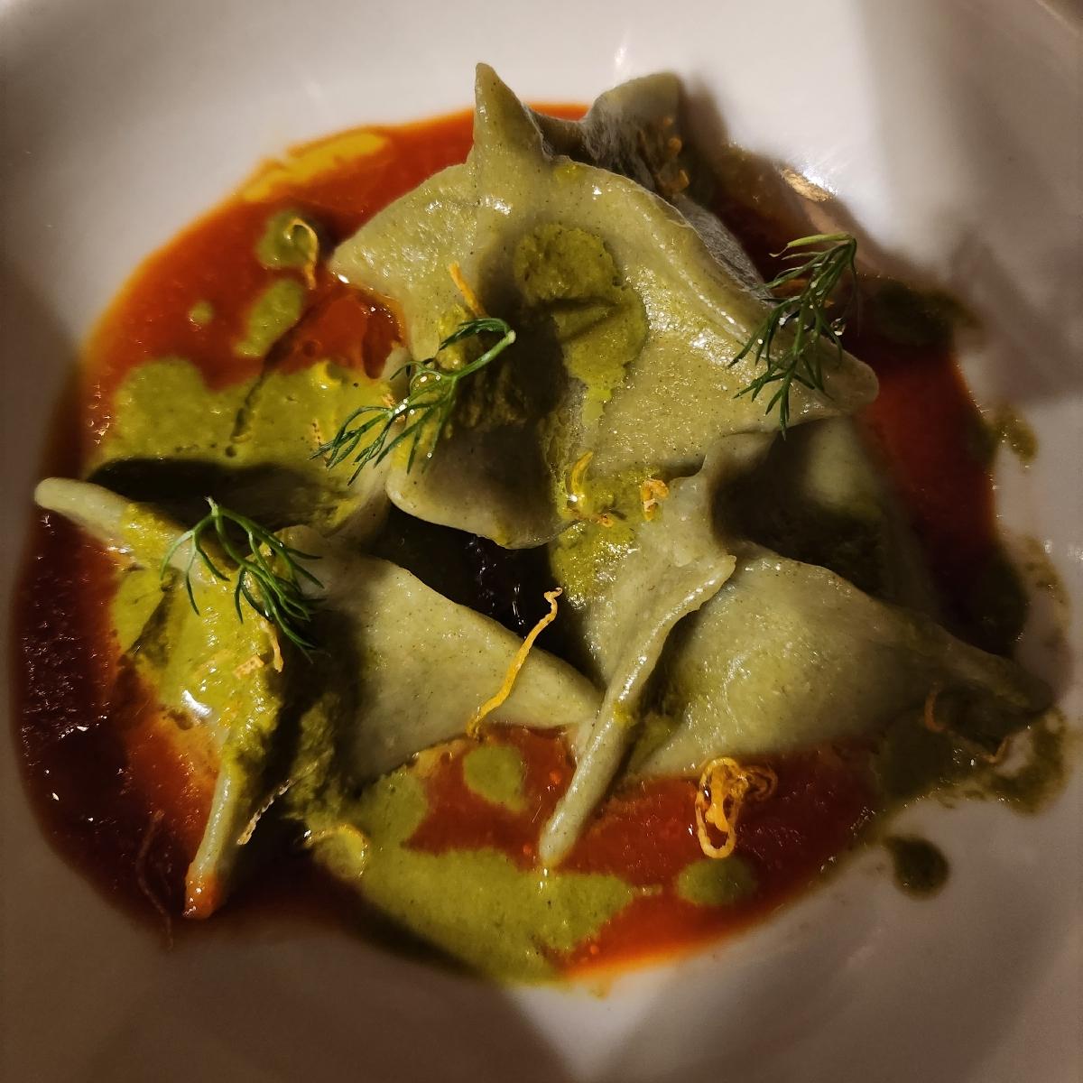 Part of my new year's dinner, homemade pasta filled with mopur with a sauce of roasted tomatoes and fennel 🌿 Always happy to come to this amazing place🍂