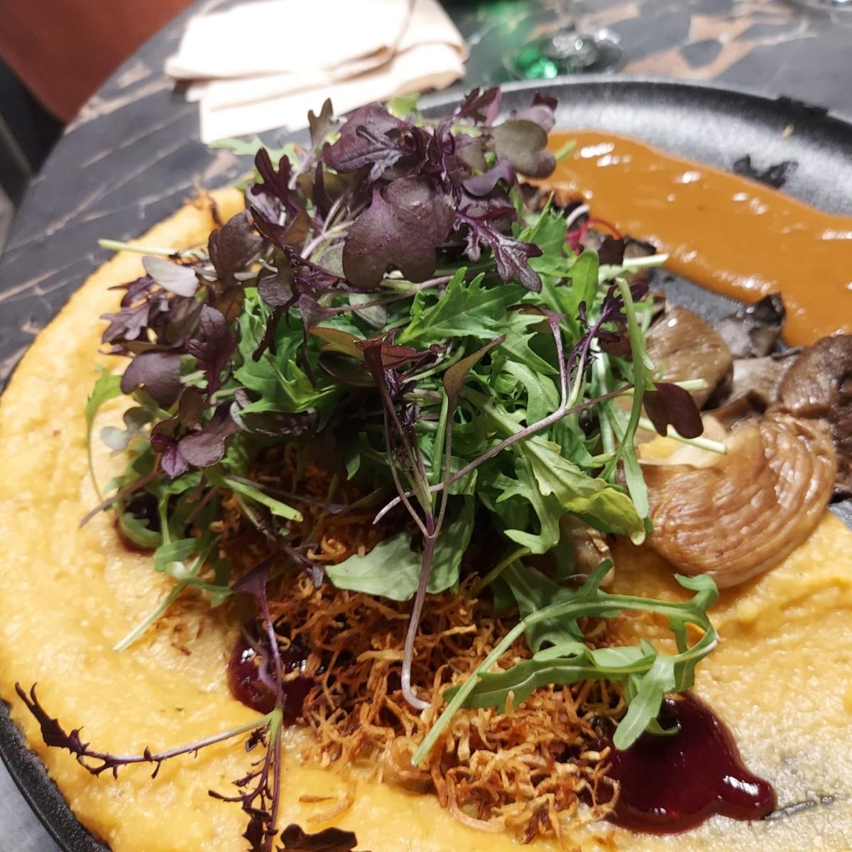 Funghi Oyster, con una salsa di pane (per i veneti, la consistenza ricorda la pearà), composta ai frutti rossi, crumble, salsa ai funghi, insalata mista.