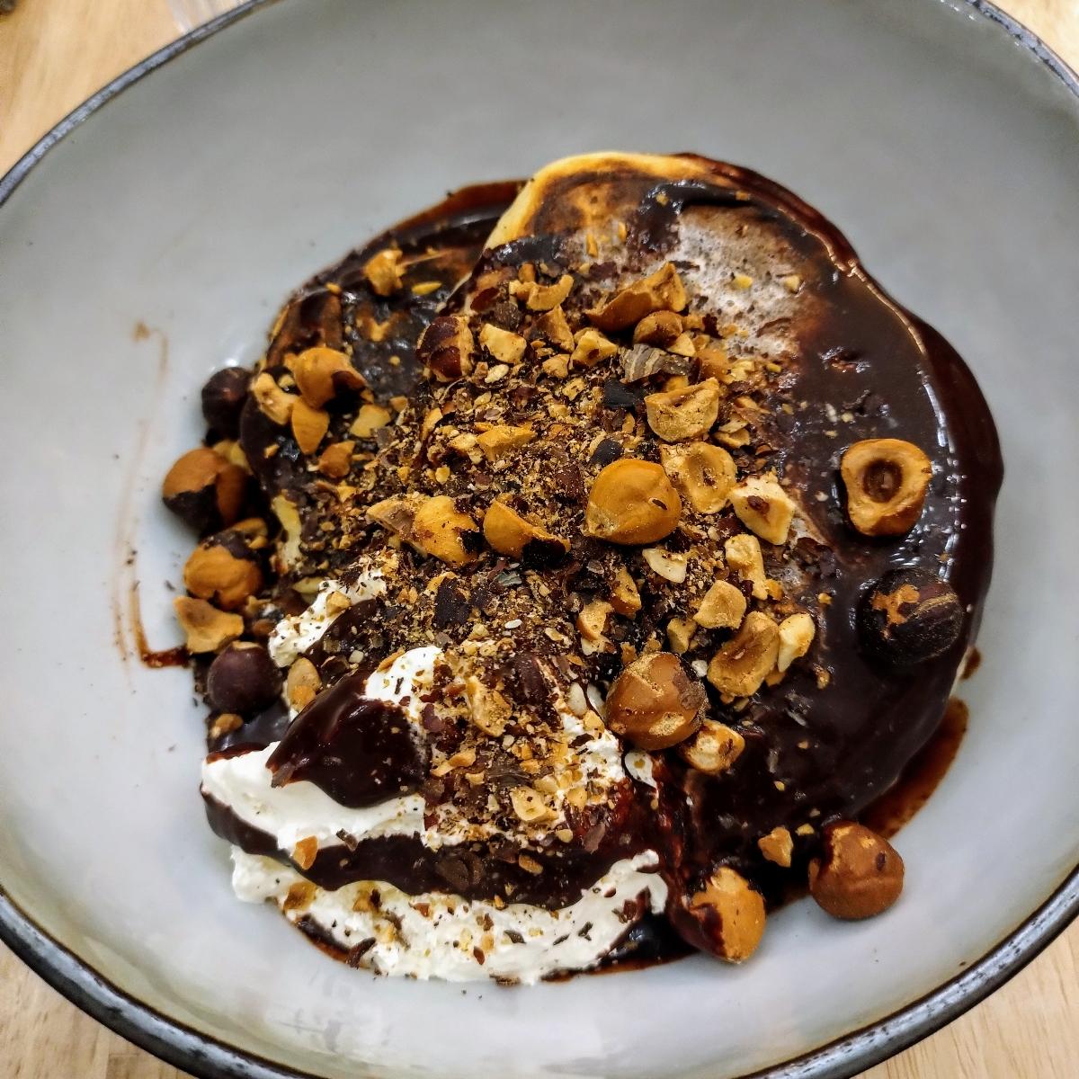 Pancakes con sciroppo al cioccolato, panna montata e nocciole tostate. È un locale super carino e 100% vegan. Fanno anche i pancakes salati con finto bacon e tofu strapazzato. I pancakes sono ottimi, alti e fluffy, non si vedono in foto ma erano anche molto belli. Il cioccolato è un po' poco e avrei preferito una crema spalmabile non cioccolata liquida.