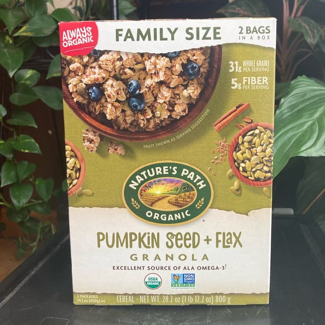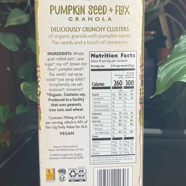 I would say this is a generally healthy product. One serving provides 700mg of ALA, 31g of whole grains, 5 grams of fiber, and 6g of protein. The sugar content and the oil kind of turn me off though. But at least it contains mostly unsaturated fat and only a little saturated fat. And it contains healthy rolled oats, pumpkin seeds, and flax seeds.