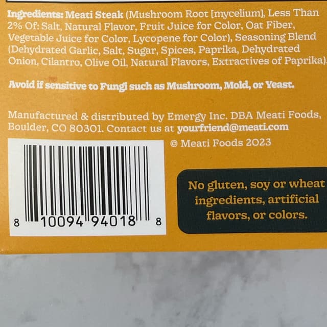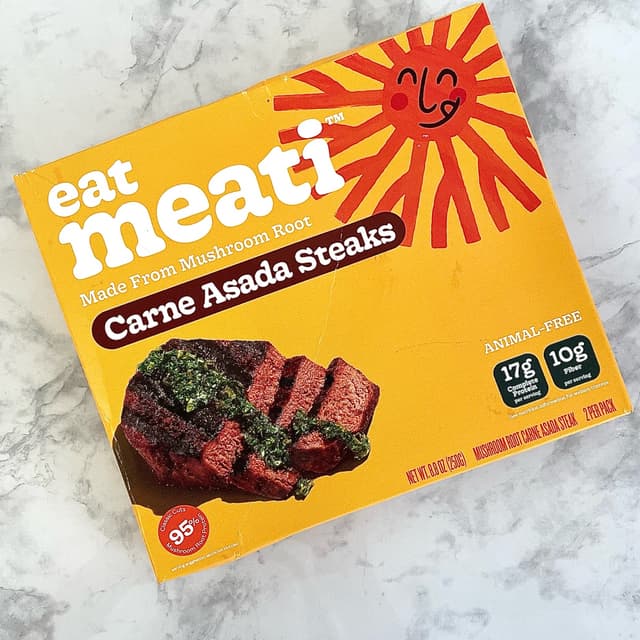 Made primarily from mushroom root (mycelium), Meati’s Carne Asada steaks have a delicious taste & texture all their own. Full stop. No animals are needed to enjoy delicious & meaty foods. I’ve enjoyed this product several times & really love to shread the steaks into taco meat.