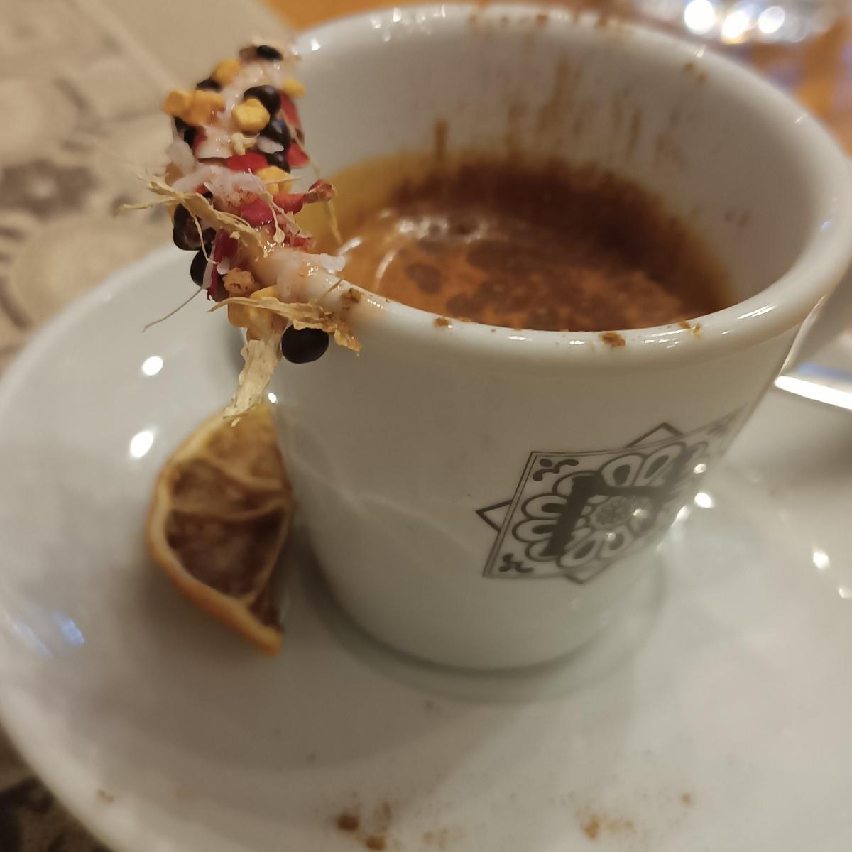 Non il solito caffè. Originale la scelta delle spezie con cardamomo e cannella servito con dattero farcito con noci