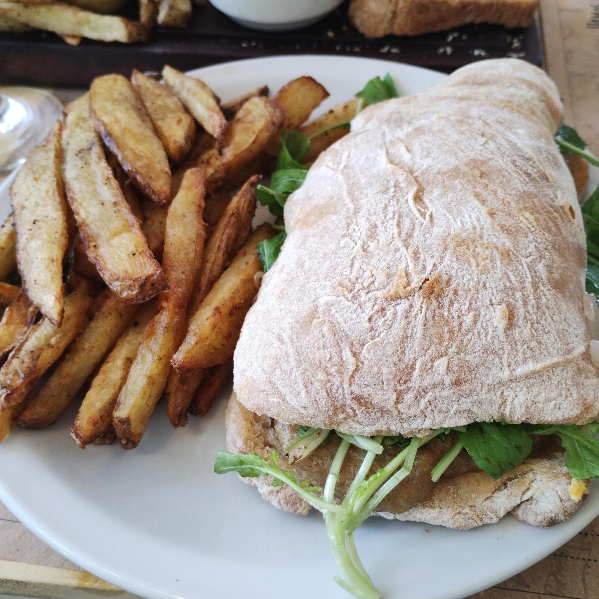 Hay varias opciones de sandwich de seitán pero ya no me acuerdo lo que tenía. Estaba muy bueno y potente. El pan un poco duro, capaz es mejor al plato. Las papas muy ricas