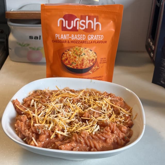 En este caso he preparado pasta de lenteja roja con atún vegetal, tomate, nata líquida soja, orégano y este queso fundido.