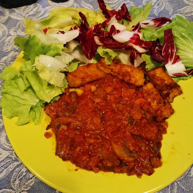 Stasera per cena ho cucinato questo tempeh di ceci ed è piaciuto a tutti, anche perché l'ho insaporito con del sugo di funghi. Perché, in effetti, è proprio insipido, io l'ho passato in padella con olio evo ma se non ci aggiungi qualche salsa è un po' come il tofu. Accostato a un'insalata mista diventa un piatto ben bilanciato, fonte di proteine e ha poche calorie 😉