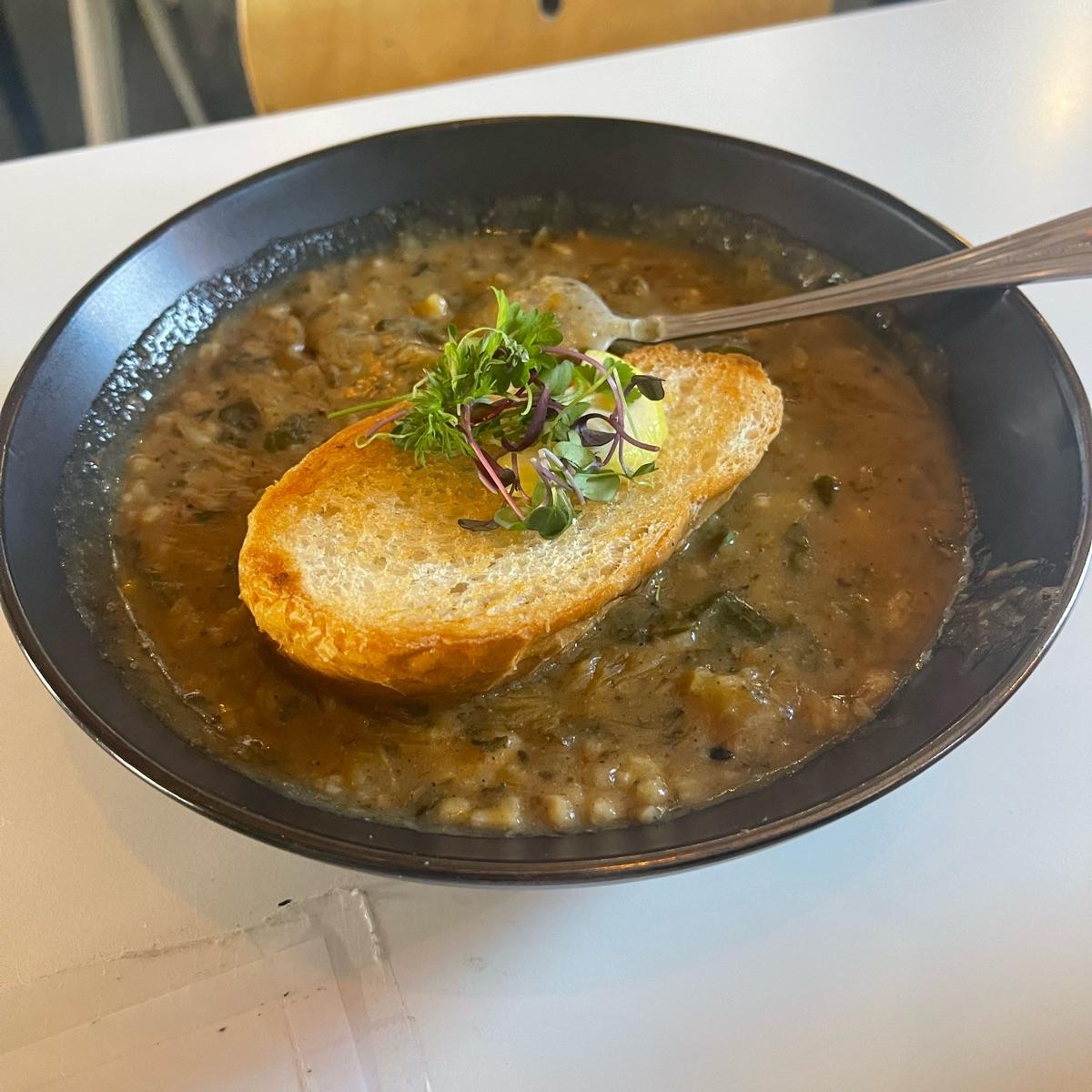 This is really delicious in this cold weather, y'all! Collard and mustard greens, celery, peppers, onions, and #vegansausage #gumbo. Served with #garlictoast.