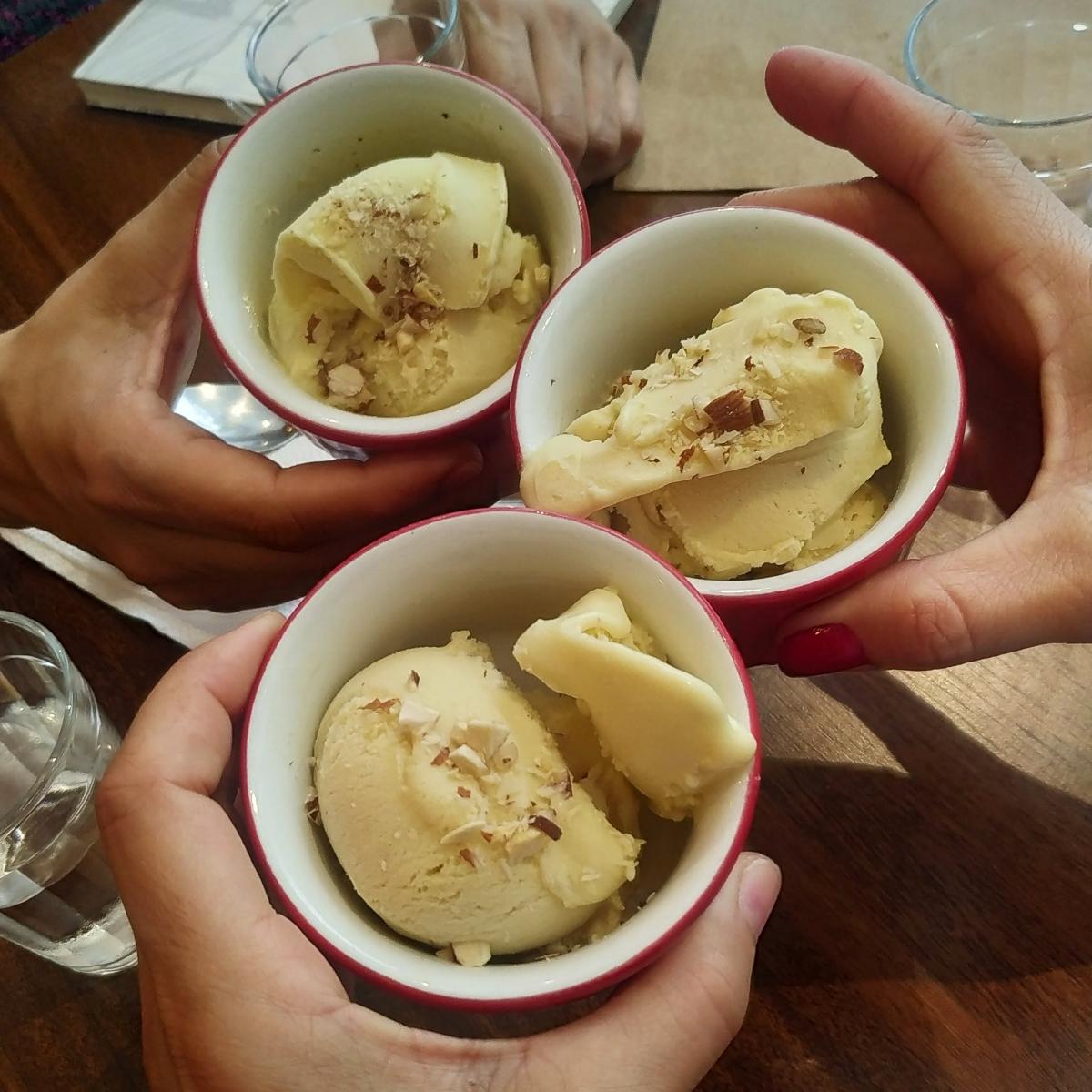 Delicioso sorvete de Baunilha , com umas lasquinhas ( talvez de amêndoas ,não me lembro o que eram). Uma bola custa em média 12,00, lembrando que a casa cobra serviço .