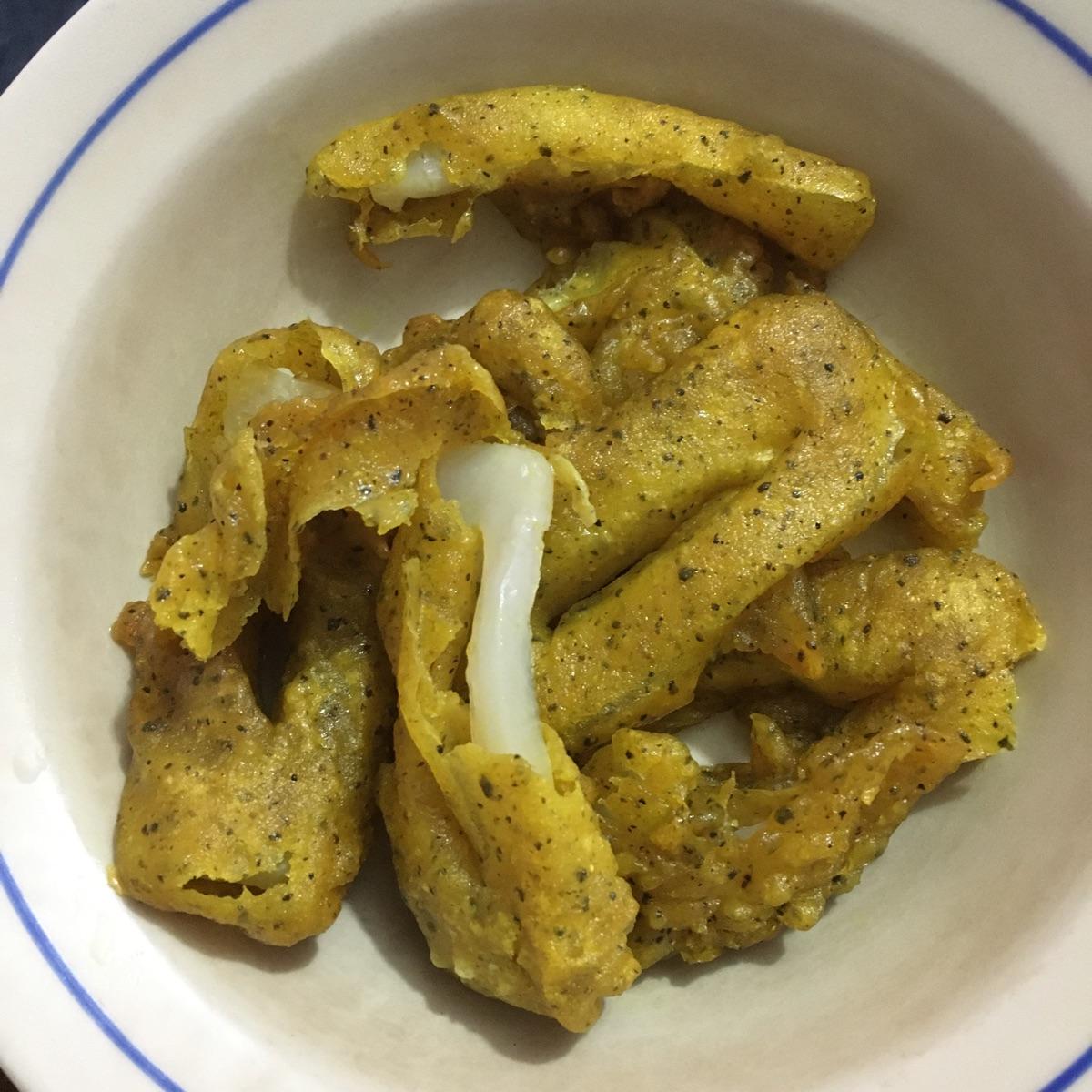 Con un fuerte sabor a mar, estos aros de tubérculo fritos y condimentados con especias son deliciosos! 🫶🏻 Se supone que sustituyen al calamar, pero como yo nunca comí no sabría decir, lo que sí es que tienen un sabor muy bueno💕