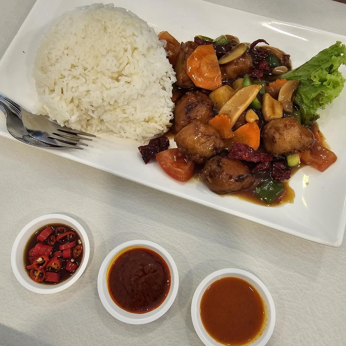 The dish is on the spicier side and the 'chicken' chunks are nice and juicy. The dish has good spice from the dried red chilies. It's my favourite at this restaurant although they provide tons of options.