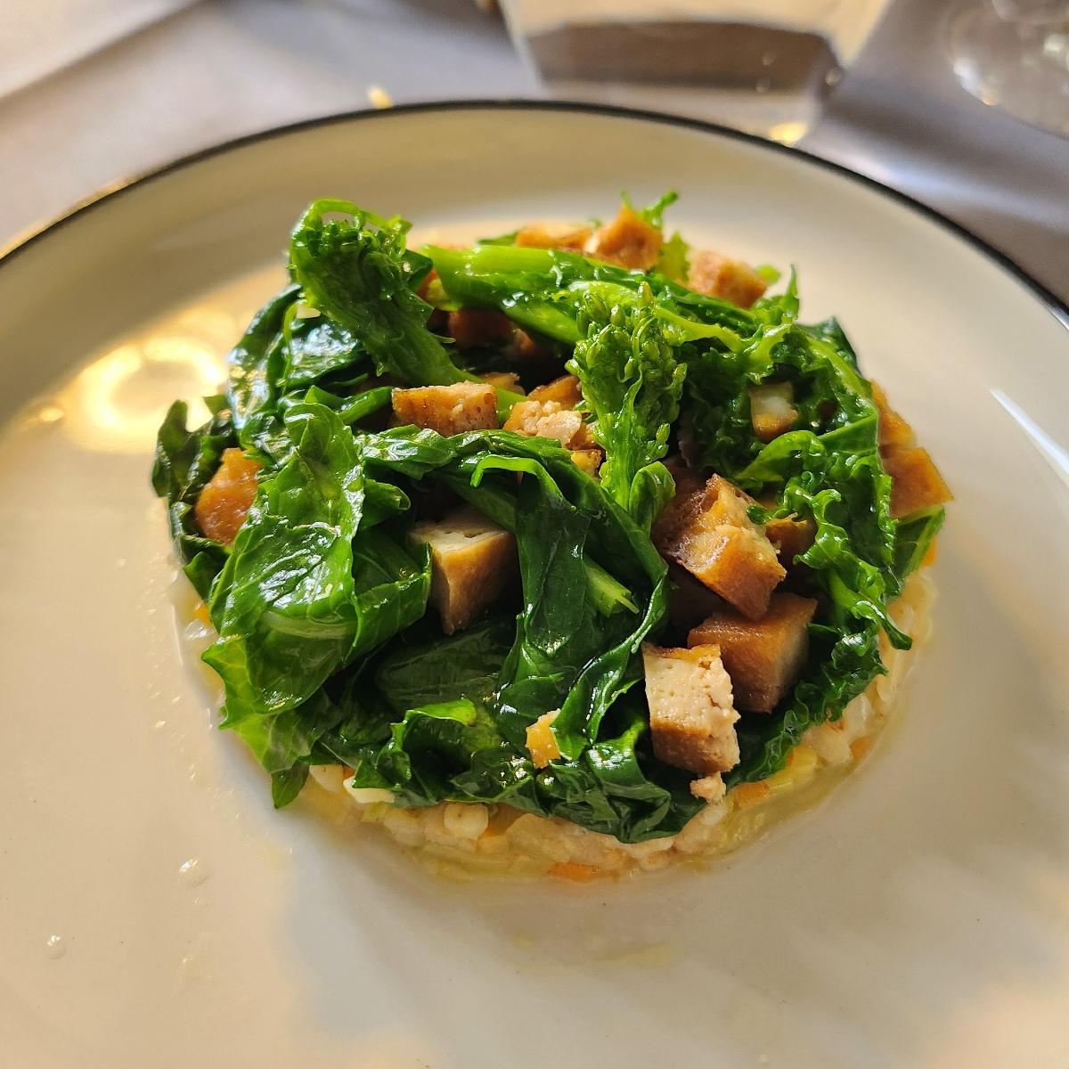 This is a appetizer made with a base of orzo, and on top smoked tofu and slightly cooked broccoli 🌿