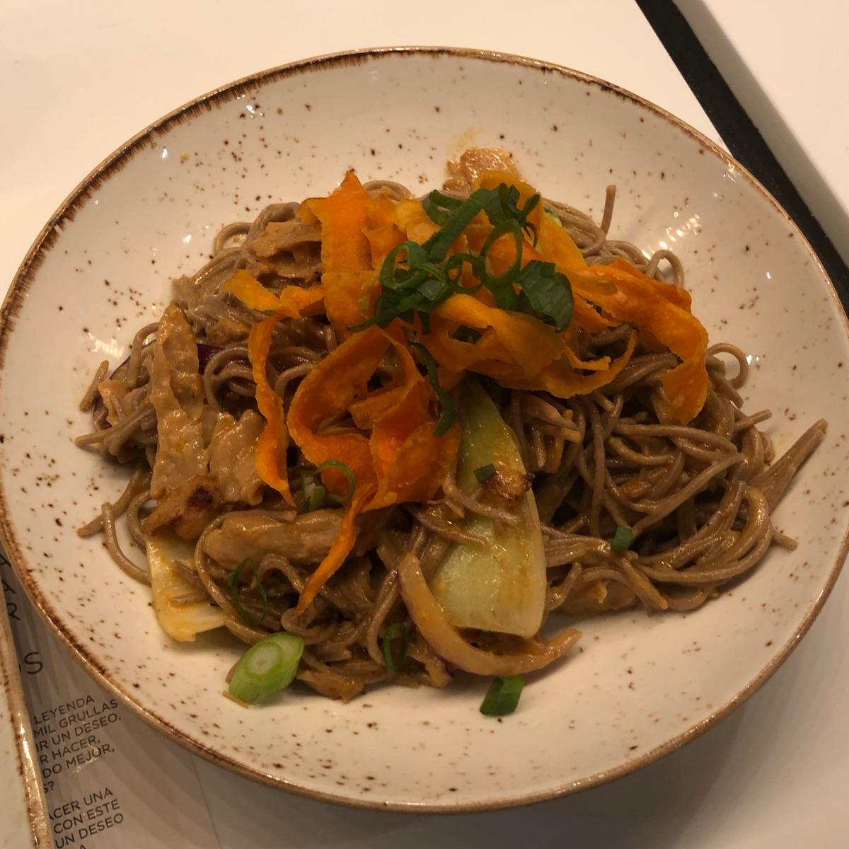 Fideo de trigo sarraceno salteado con setas shiitake y shimeji, proteína vegetal Heura, pak choi, cáscara de zanahoria frita y salsa picante de miso y leche de coco.