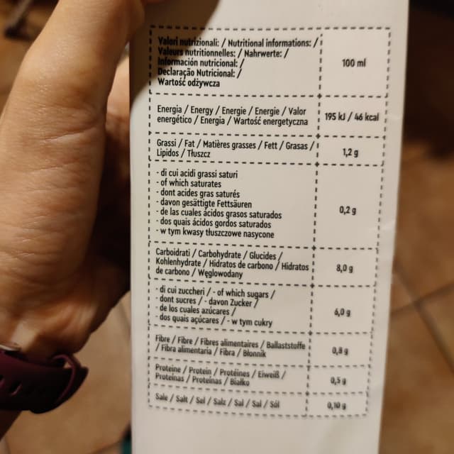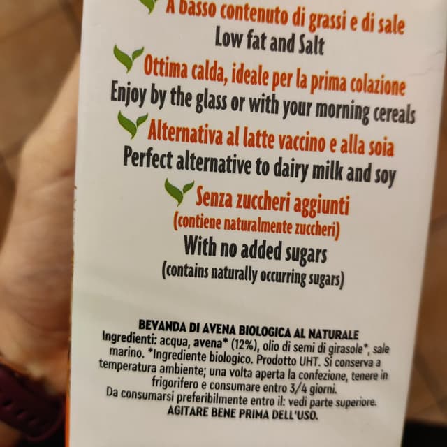 Trovato a un ottimo prezzo (1,20) all'Ipertosano. Il sapore è piacevole anche se leggermente troppo dolce nonostante non abbia zuccheri aggiunti. Come quasi tutti contiene olio di semi (ma finora ne ho trovato solo uno a base di acqua e avena) ma la percentuale di avena mi sembra buona