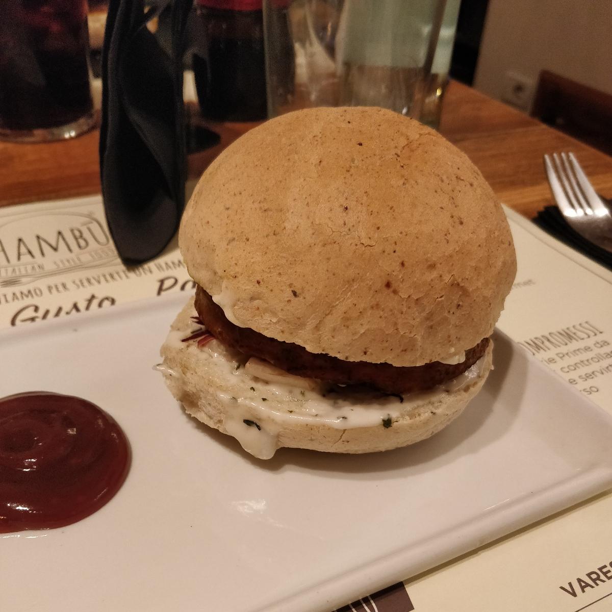 Unica scelta vegana in un menù pieno di hamburger di carne, ma ne vale davvero la pena. Molto buono! Io ho scelto l'hamburger di verdure ma si può scegliere anche quello di "finta carne".