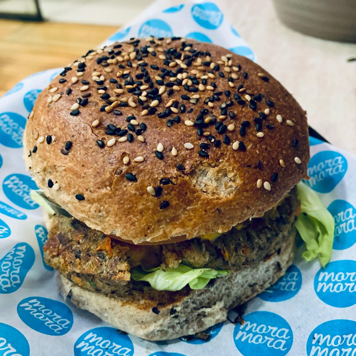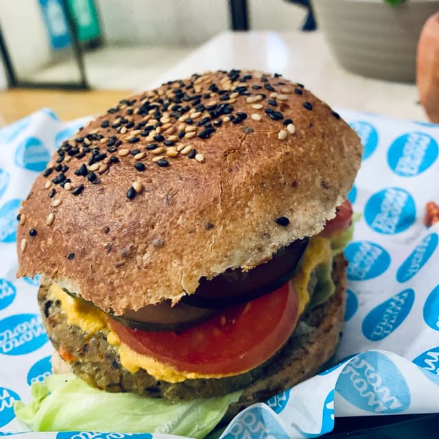 Estuvo muy rica esta hamburguesa, el medallón es de garbanzo, quinoa y verduras. El quesito cheddar es de zanahoria 🥕 y lleva cebolla caramelizada con su infaltable jitomate y lechuga 🥬 ☺️ El bollo es de masa madre, está muy rico también.