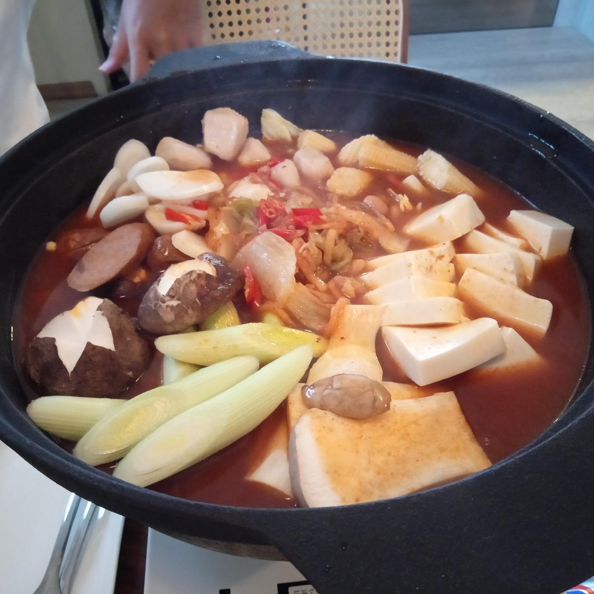 Finally a worthy item on the menu. Thanks to hilmi for letting me try this kimchi jjigae hotpot with baby corn, king oyster mushrooms, tteokboki and plant sausages