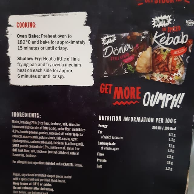 Water, breading 23% [rice flour, dextrose, salt, emulsifier (mono and diglycerides of fatty acids), maize flour, chilli flakes 4.9%, tomato powder, parsley, rapeseed oil, colour (paprika extract), maize starch, potato starch, salt, raising agent (diphosphates, sodium carbonate), thickener (xanthan gum)], SOYA protein concentrate 13%, sunflower oil, gluten free OAT husk fibre, salt, thickener (methyl cellulose), natural flavouring, dextrose.