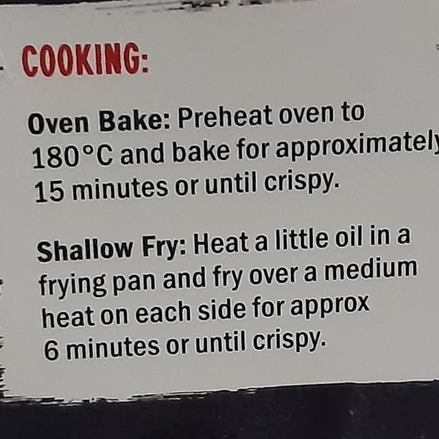 Shallow Fry: Heat a little oil in a frying pan and fry over a medium heat on each side for approx 6 minutes or until crispy.