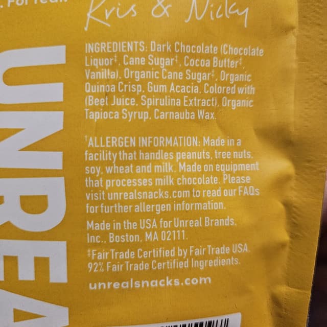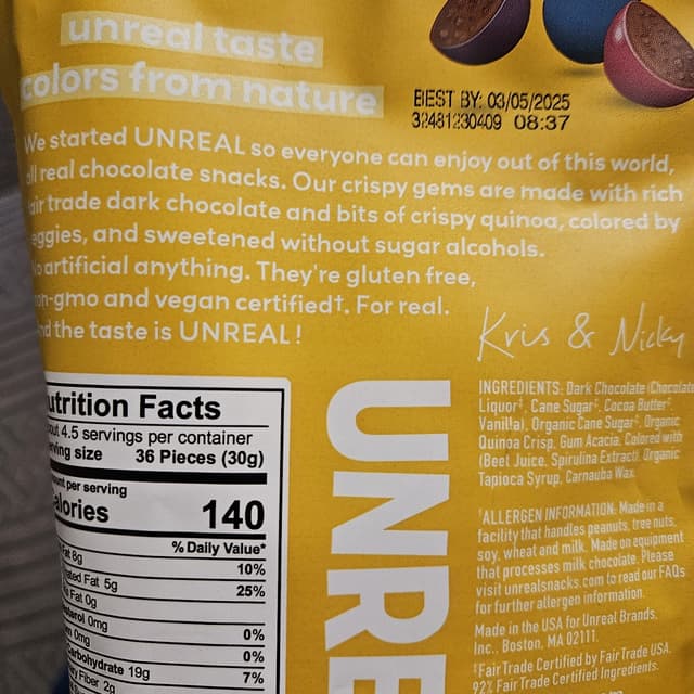Received these as a gift and if you were a M&M fan then you will like these. Taste very similar..Dark chocolate is great. Made with quinoa. colors from veggies. A great treat. And a great chocolate fix.