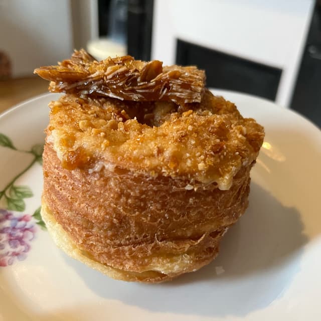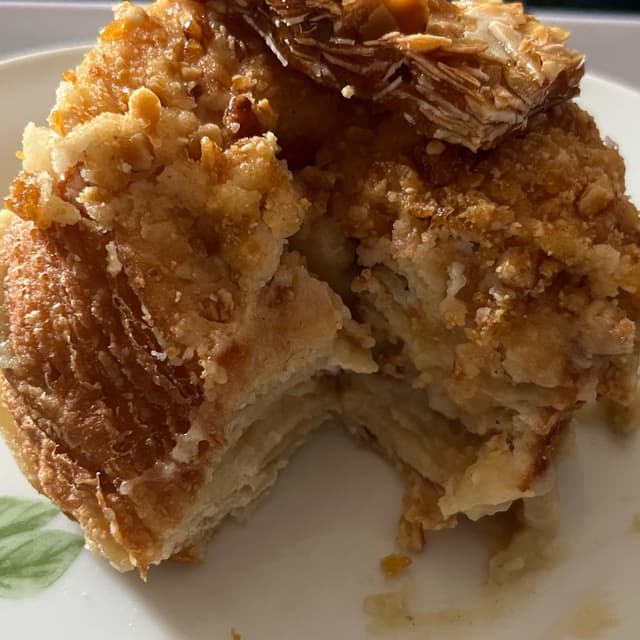 Sur une base de pâte feuilletée et d’un beignet fourré à la crème pâtissière amande avec un glaçage au beurre de rhum, le tout surmonté d’un morceau amande praliné.