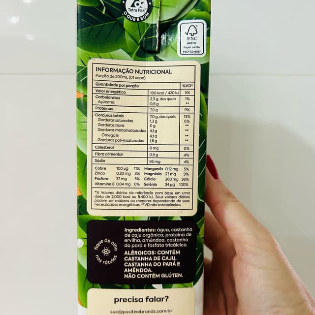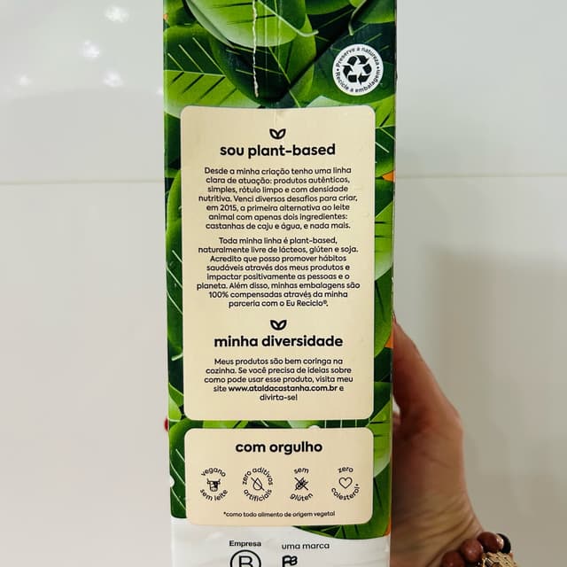 Leite vegetal de castanha de cajú, castanha do Pará e amêndoas, gostoso e nutritivo, como todas as bebidas da marca…. Esse leite é bem cremoso, não contém gomas, sem conservantes, sem adição de açúcares, sem adoçantes, sem aromatizantes e espessastes. Tudo de bom. Só podia ter um preço mais acessível, normalmente custa uns R$ 24,00, paguei R$18,00 na promoção.