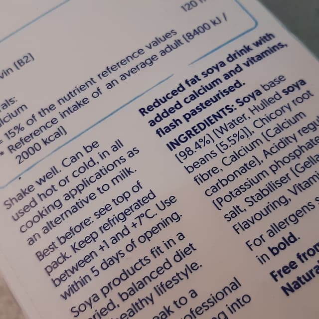 Soya base (Water, Hulled soya beans (5.6%)), Soluble corn fibre, Fructose, Sugar, Calcium (Calcium carbonate), Acidity regulator (Potassium phosphates), Sea salt, Flavouring, Stabiliser (Gellan gum), Natural flavouring, Vitamins (B2, B12, D2).