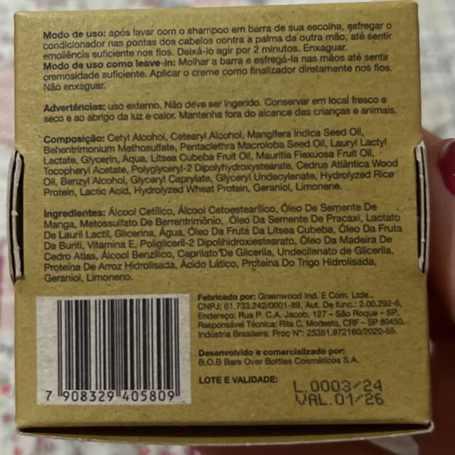 Condicionador e modelador em barra, muito hidratante. Com óleo de pracaxi e buriti; queratina vegetal, cedro e May chang. Tem cheiro de chá. Realmente hidrata e modela o cabelo, se usado após o banho. Gostei recomendo