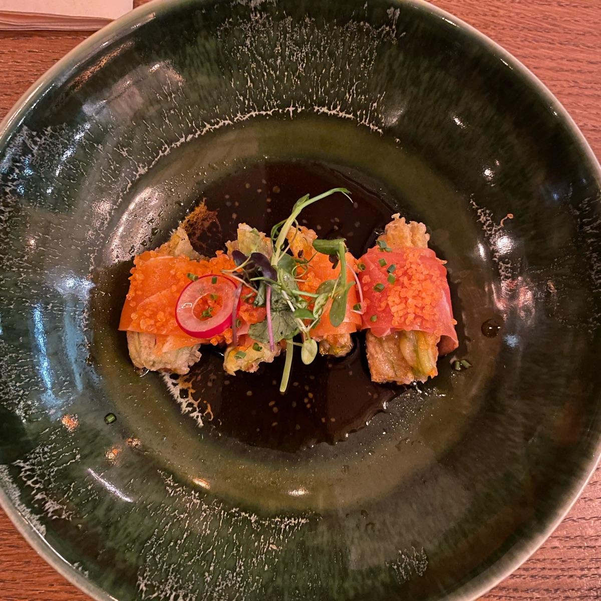 Questi fiori di zucca con tonno e salmone veg sono molto buoni, ma rispetto ad altri piatti sul menu però non mi hanno fatto impazzire